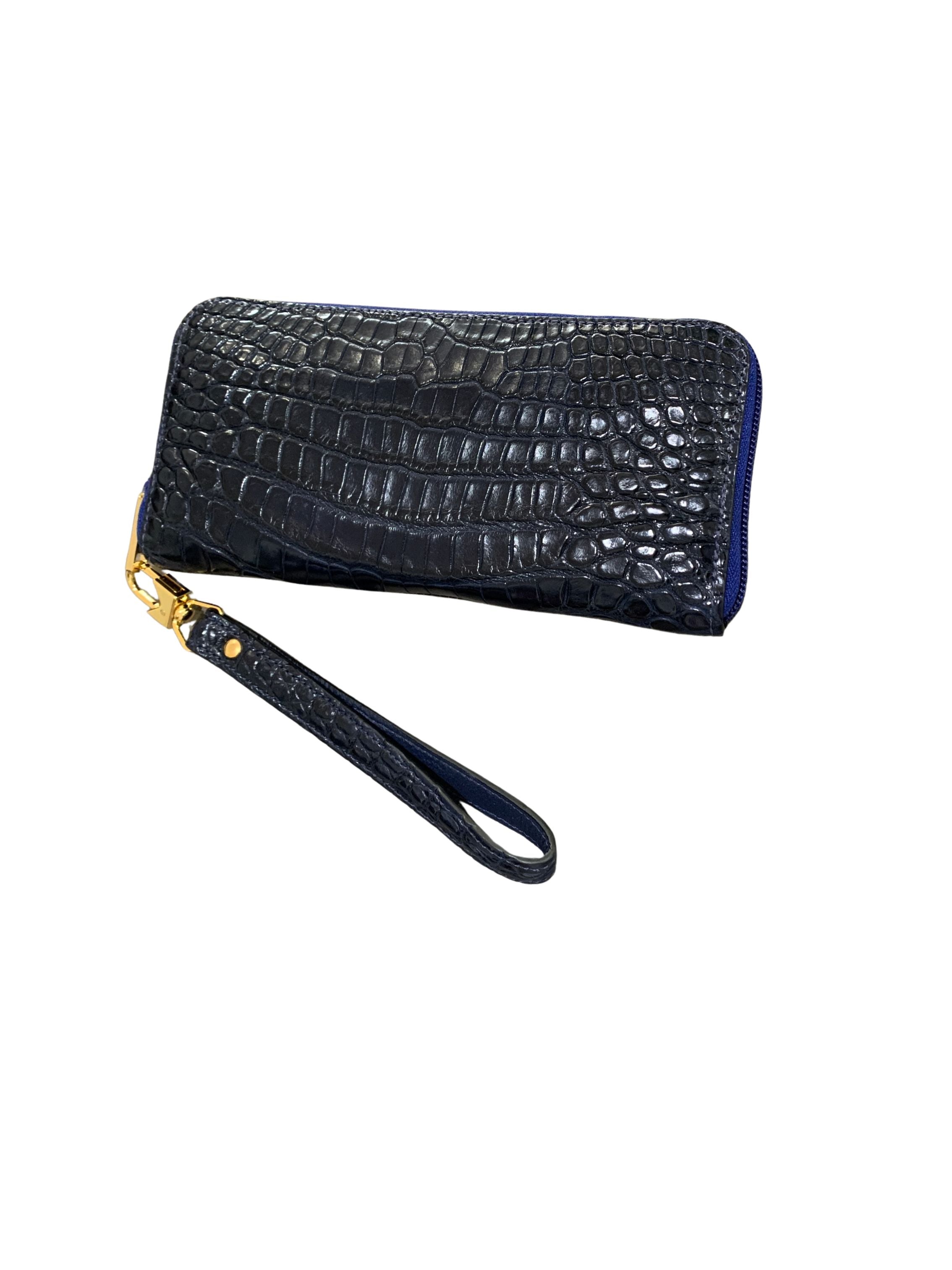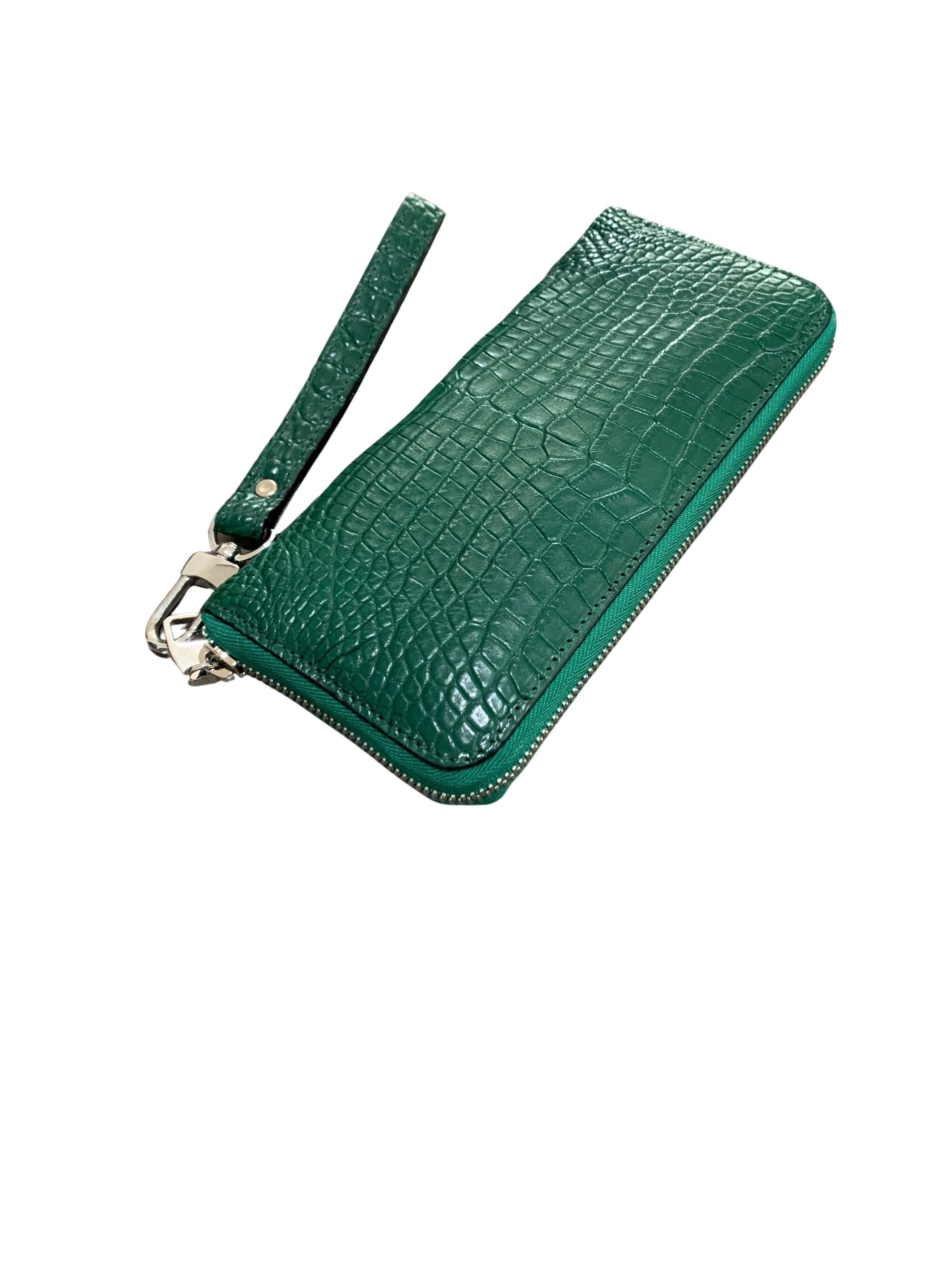 One of Arley Rae's most popular designs, the Michaela purse is made from a unique Australian saltwater crocodile belly skin exterior with genuine cow hide inserts and a secure zip all around. The Michaela has eight slots on each side to hold cards, a zip pocket for any coins, a wrist strap, and extra room for any additional items.