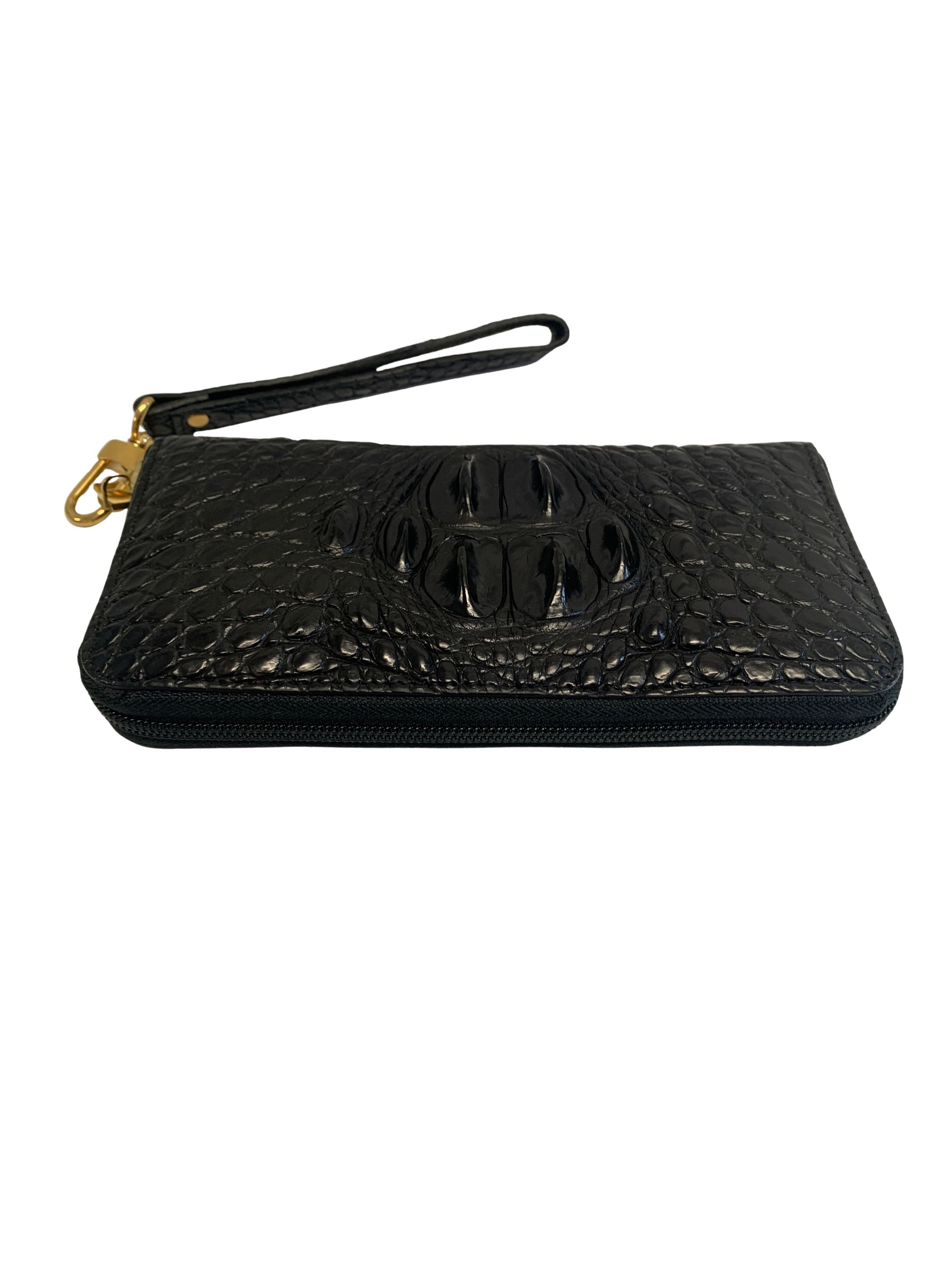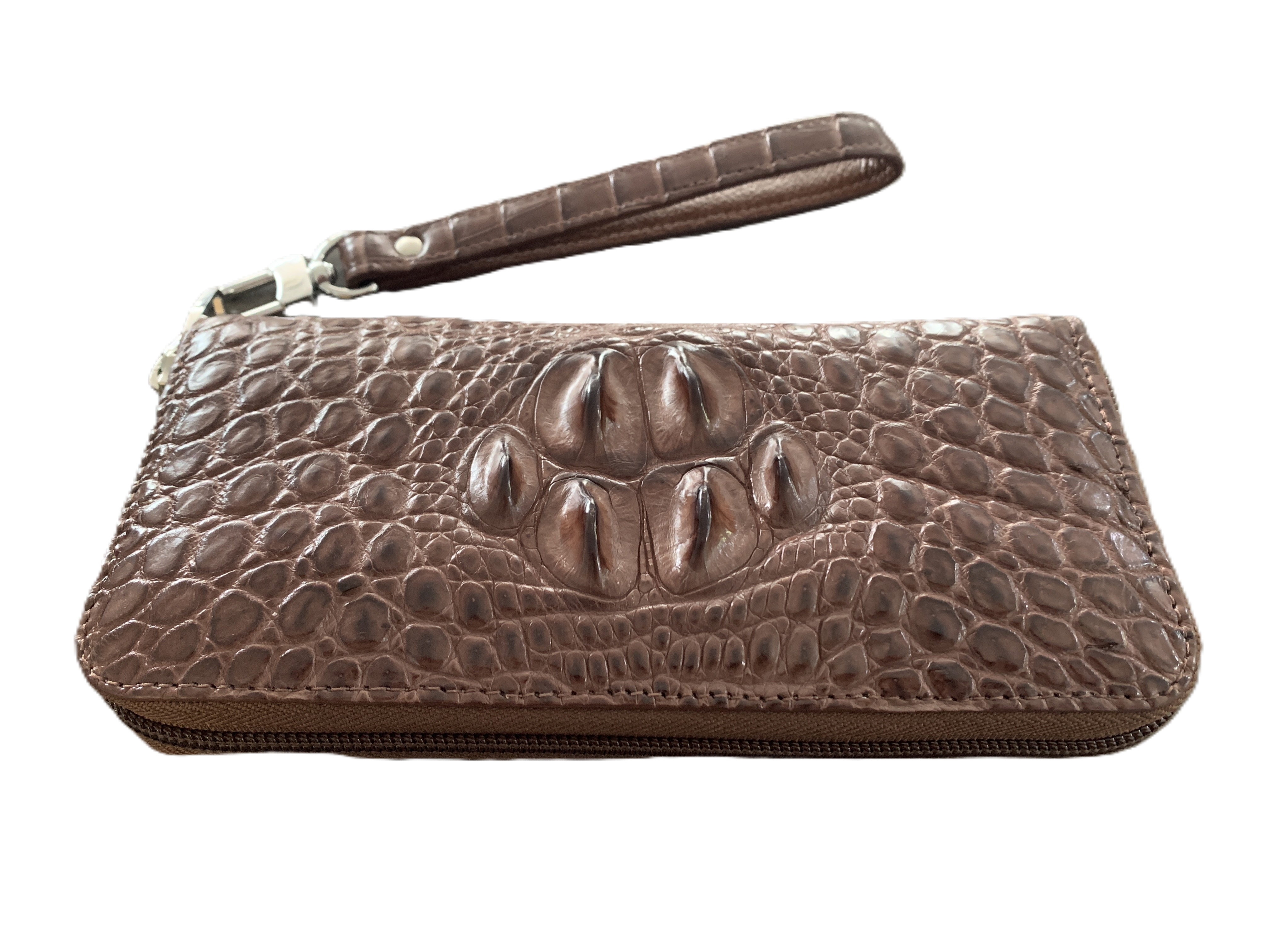 One of Arley Rae's most popular designs, but with a twist. The Michaela Hornback has a unique Australian saltwater crocodile skin exterior, with genuine cow hide inserts and a secure zip all around. The interior has eight slots on each side to hold cards, a zip pocket for any coins, a wrist strap, and extra room for any additional items.