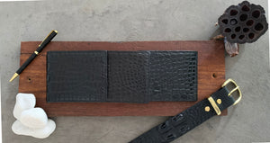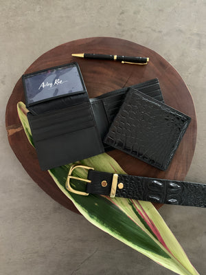 Slim and lightweight, these Australian saltwater crocodile leather wallets feature eight card slots, a flip ID pocket, two slip pockets, and two note pockets.